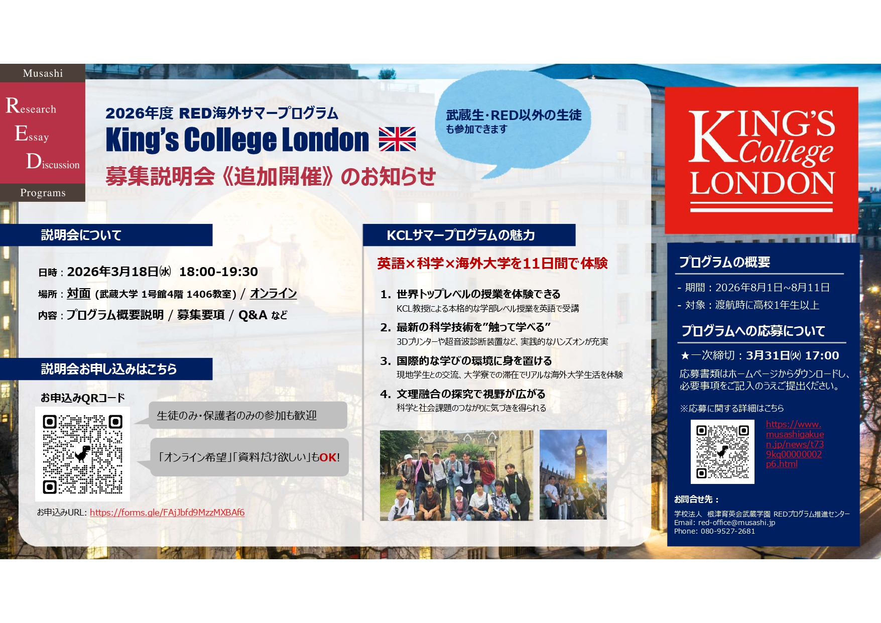 【(渡航時) 高校生対象】3月追加開催!サマープログラム in King's College London 募集説明会