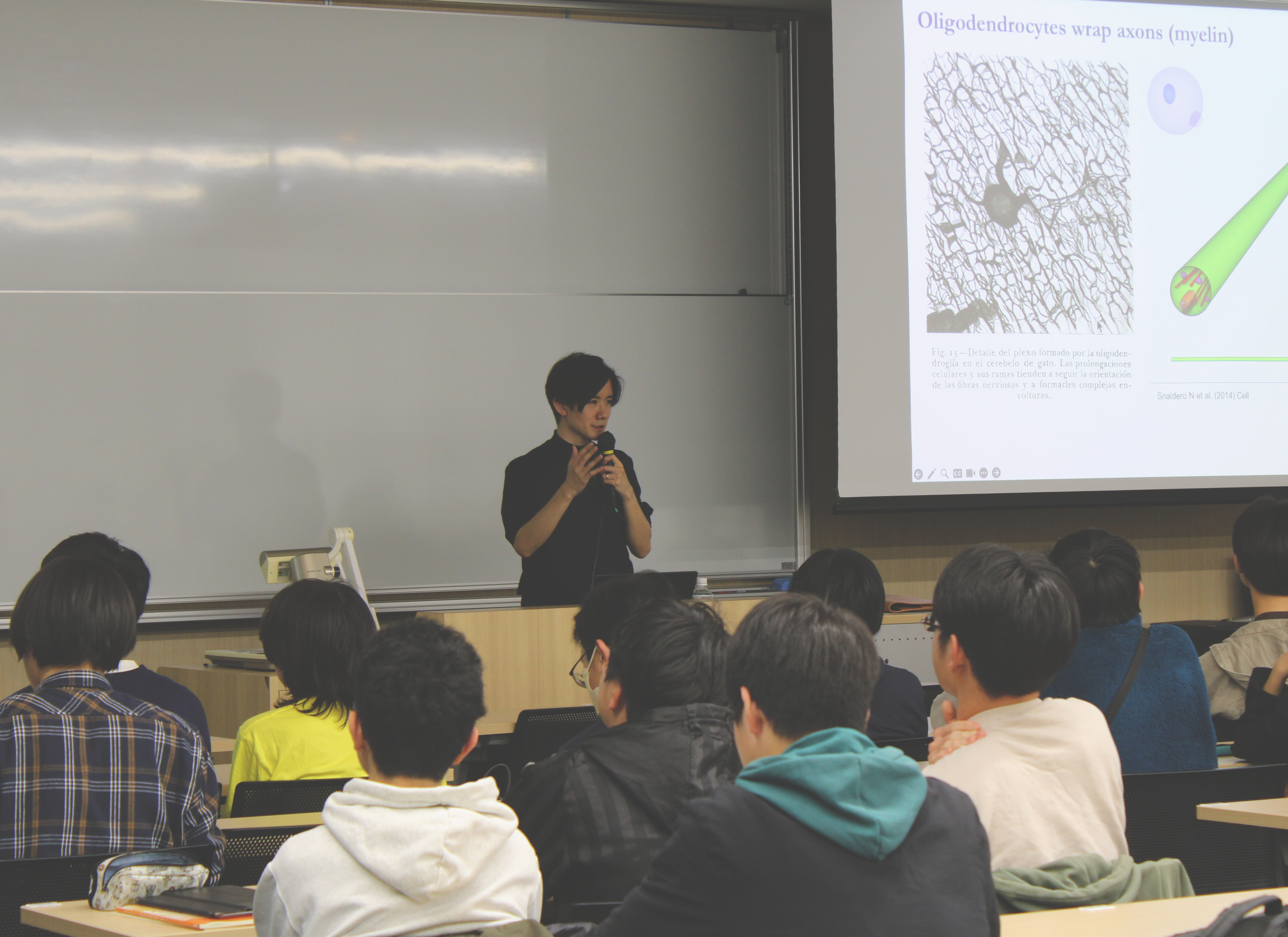 講演では、タイトルにもあるグリア細胞を中心にお話いただきました。これまでニューロンを支える脇役と考えられてきたグリアが、記憶や行動、脳疾患にも深く関与していることが、近年の研究から明らかになってきています。ニューロンが「子ども」なら、グリア細胞は「親」のような存在であるという身近な例えを交えた説明に、生徒たちは熱心に耳を傾けていました。そして、アストロサイト (グリア細胞の一種) がADHDといった疾患にどのように影響しているかについての研究紹介や、脳科学が医療にとどまらず、マーケティングや神経法学などの社会のさまざまな分野と結びついていることについても紹介されました。